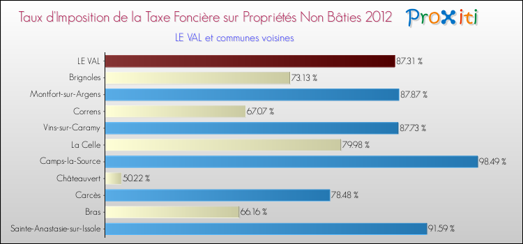 Vous trouverez ci-dessous des graphiques qui vous permettent de situer le taux de la taxe foncière sur le non bâti de Le Val par rapport aux communes voisines.