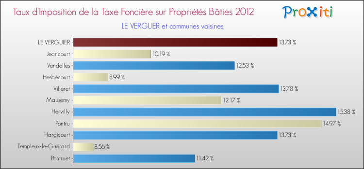 En 2012, le taux de la taxe foncière sur le bâti vôté par le conseil municipal de Le Verguier était de : 13.73 %.