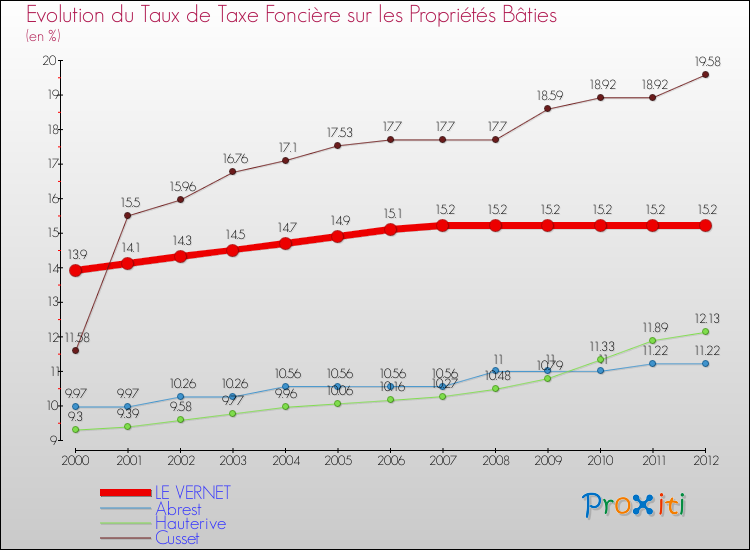 A Le Vernet, le taux de taxe foncière sur le bâti a donc augmenté de 9.35 % entre 2000 et 2012.