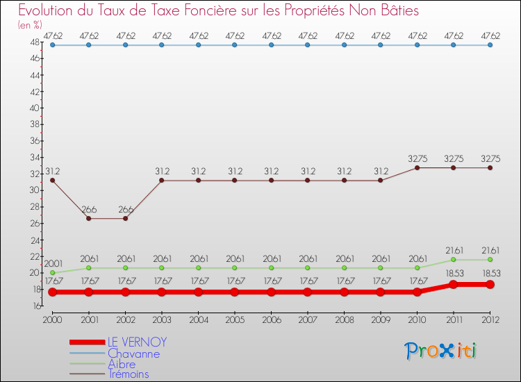 En 2012, le taux de la taxe foncière sur le non bâti vôté par le conseil municipal de Le Vernoy était de : 18.53 %.