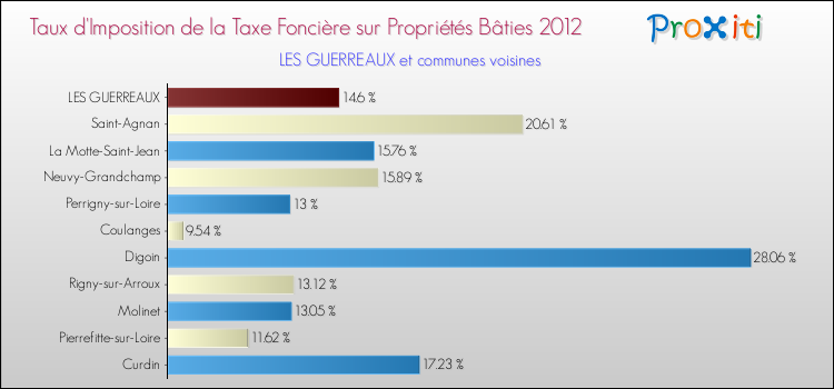 A noter : la valeur moyenne de ce taux de taxe foncière sur le bâti dans les communes françaises similaires à Les Guerreaux était de 14.72 %, en 2012.