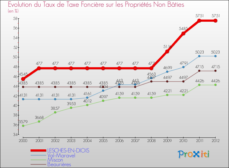 Pendant la même période, les communes françaises similaires à Lesches-en-Diois, ont vu leur taux de taxe foncière sur le non bâti augmenter de 4.04 % en moyenne entre 2000 et 2012.