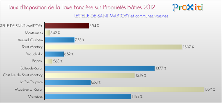 En 2012, le taux de la taxe foncière sur le bâti vôté par le conseil municipal de Lestelle-de-Saint-Martory était de : 8.54 %.