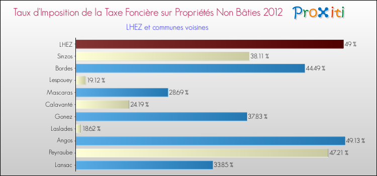 En 2012, le taux de la taxe foncière sur le non bâti vôté par le conseil municipal de Lhez était de : 49 %.