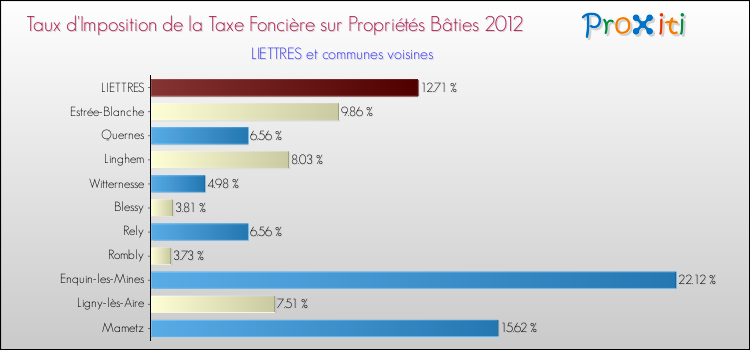 En 2012, le taux de la taxe foncière sur le bâti vôté par le conseil municipal de Liettres était de : 12.71 %.