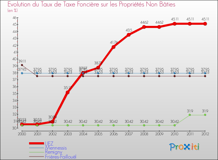 Pendant la même période, les communes françaises similaires à Liez, ont vu leur taux de taxe foncière sur le non bâti augmenter de 29.51 % en moyenne entre 2000 et 2012.