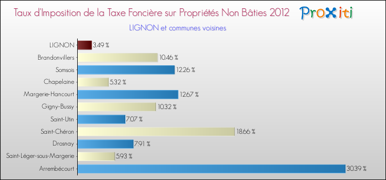 En 2012, le taux de la taxe foncière sur le non bâti vôté par le conseil municipal de Lignon était de : 3.49 %.