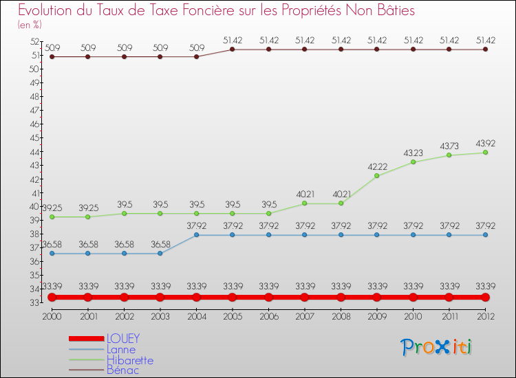 A Louey, le taux de taxe foncière sur le non bâti a donc augmenté de 0 % entre 2000 et 2012.