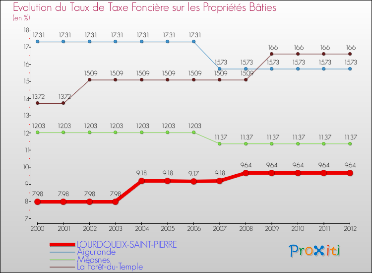 A Lourdoueix-Saint-Pierre, le taux de taxe foncière sur le bâti a donc augmenté de 20.8 % entre 2000 et 2012.