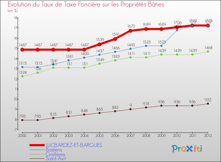 A Lucbardez-et-Bargues, le taux de taxe foncière sur le bâti a donc augmenté de 15.87 % entre 2000 et 2012.