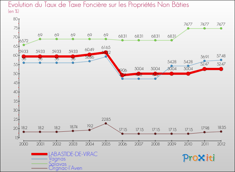 Pendant la même période, les communes françaises similaires à Labastide-de-Virac, ont vu leur taux de taxe foncière sur le non bâti baisser de 16.24 % en moyenne entre 2000 et 2012.