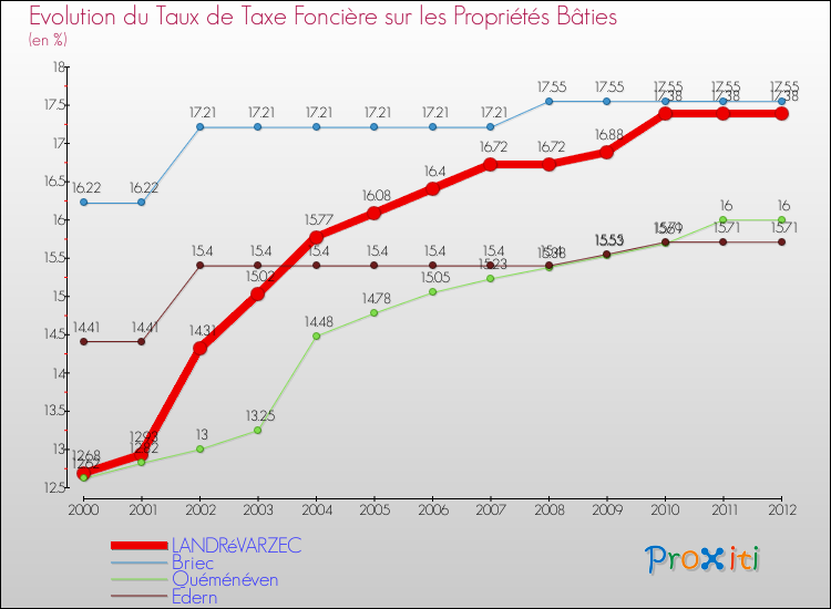 En 2012, le taux de la taxe foncière sur le bâti vôté par le conseil municipal de Landrévarzec était de : 17.38 %.
