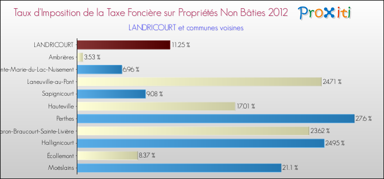 En 2012, le taux de la taxe foncière sur le non bâti vôté par le conseil municipal de Landricourt était de : 11.25 %.