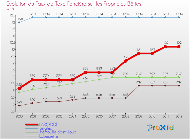 A Larodde, le taux de taxe foncière sur le bâti a donc augmenté de 42.66 % entre 2000 et 2012.