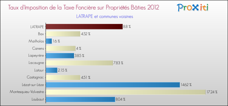 A noter : la valeur moyenne de ce taux de taxe foncière sur le bâti dans les communes françaises similaires à Latrape était de 11.88 %, en 2012.