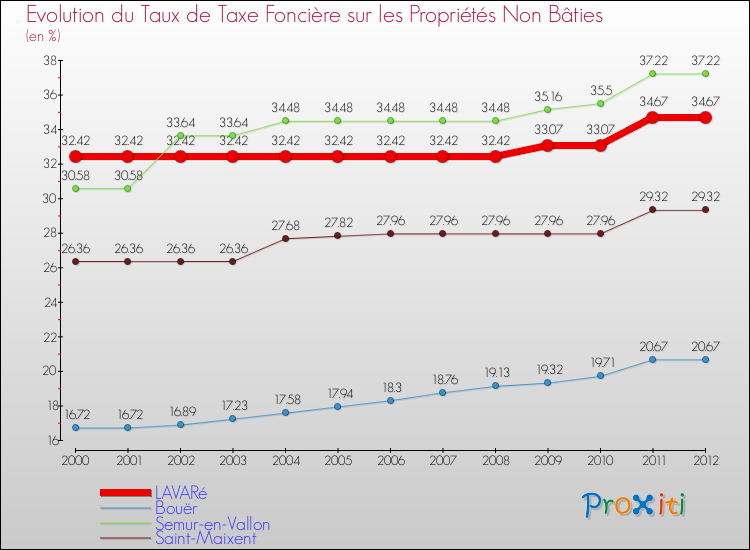 A Lavaré, le taux de taxe foncière sur le non bâti a donc augmenté de 6.94 % entre 2000 et 2012.