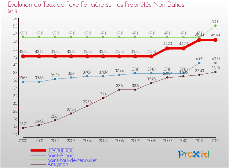 Pendant la même période, les communes françaises similaires à Lesquerde, ont vu leur taux de taxe foncière sur le non bâti augmenter de 25.51 % en moyenne entre 2000 et 2012.