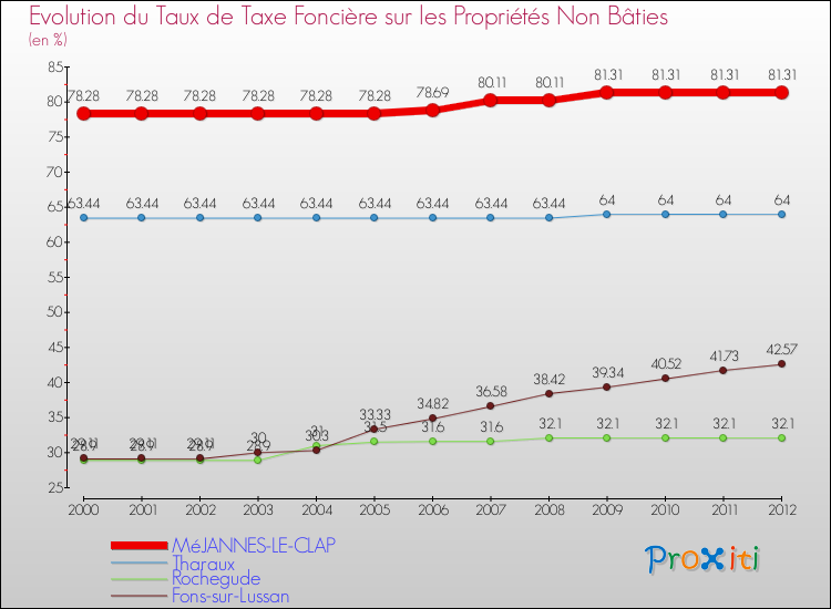 Pendant la même période, les communes françaises similaires à Méjannes-le-Clap, ont vu leur taux de taxe foncière sur le non bâti augmenter de 35.22 % en moyenne entre 2000 et 2012.