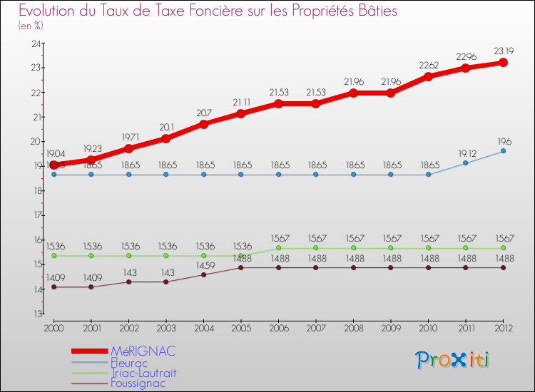 Pendant la même période, les communes françaises similaires à Mérignac, ont vu leur taux de taxe foncière sur le bâti augmenter de 22.76 % en moyenne entre 2000 et 2012.