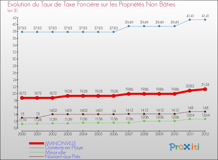 A Manonville, le taux de taxe foncière sur le non bâti a donc augmenté de 13.46 % entre 2000 et 2012.