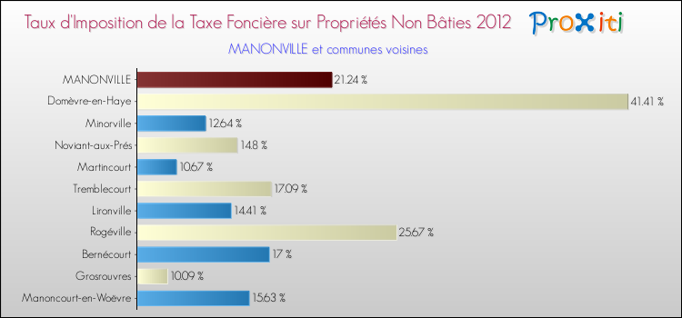 En 2012, le taux de la taxe foncière sur le non bâti vôté par le conseil municipal de Manonville était de : 21.24 %.