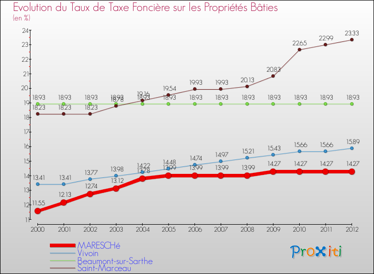 A Maresché, le taux de taxe foncière sur le bâti a donc augmenté de 23.55 % entre 2000 et 2012.