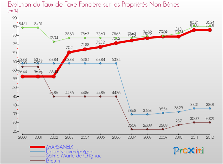 A Marsaneix, le taux de taxe foncière sur le non bâti a donc augmenté de 47.2 % entre 2000 et 2012.