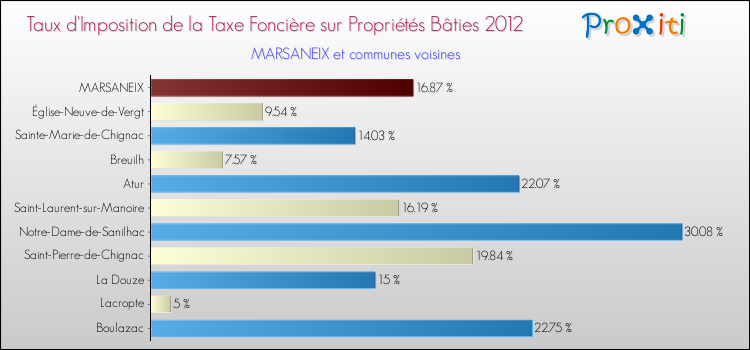 En 2012, le taux de la taxe foncière sur le bâti vôté par le conseil municipal de Marsaneix était de : 16.87 %.
