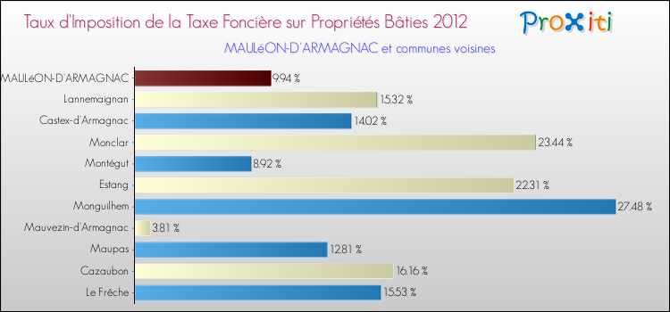 A noter : la valeur moyenne de ce taux de taxe foncière sur le bâti dans les communes françaises similaires à Mauléon-d'Armagnac était de 11.88 %, en 2012.