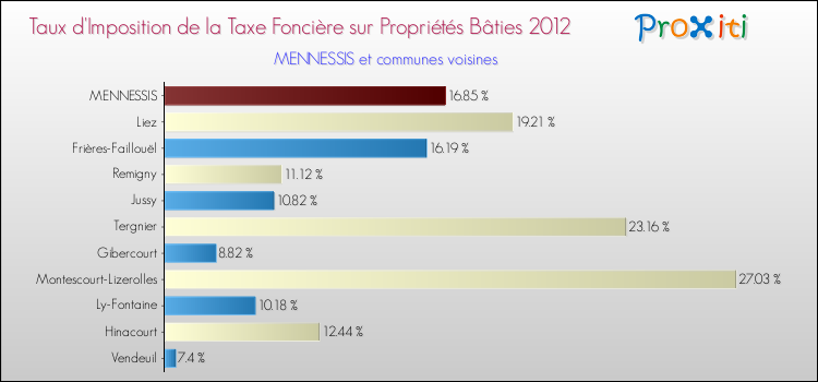 En 2012, le taux de la taxe foncière sur le bâti vôté par le conseil municipal de Mennessis était de : 16.85 %.