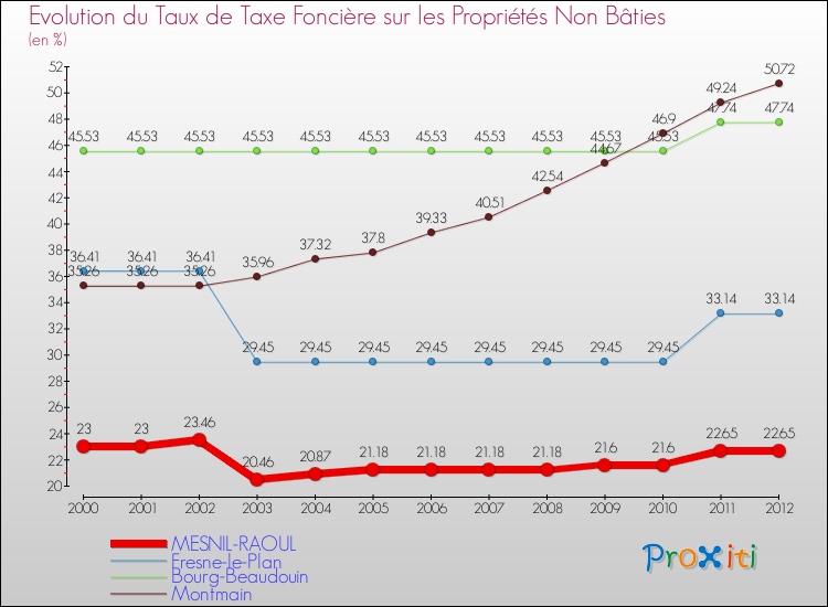 A Mesnil-Raoul, le taux de taxe foncière sur le non bâti a donc baissé de 1.52 % entre 2000 et 2012.