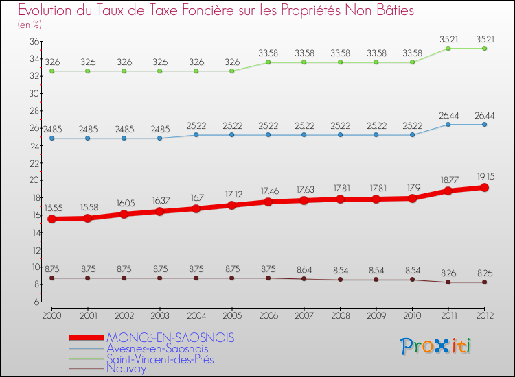 Pendant la même période, les communes françaises similaires à Moncé-en-Saosnois, ont vu leur taux de taxe foncière sur le non bâti augmenter de 16.95 % en moyenne entre 2000 et 2012.