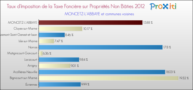 Vous trouverez ci-dessous des graphiques qui vous permettent de situer le taux de la taxe foncière sur le non bâti de Moncetz-l'Abbaye par rapport aux communes voisines.
