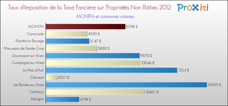 En 2012, le taux de la taxe foncière sur le non bâti vôté par le conseil municipal de Montfa était de : 85.98 %.