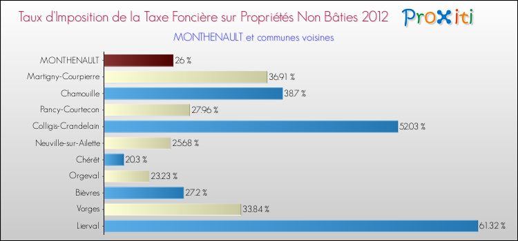 En 2012, le taux de la taxe foncière sur le non bâti vôté par le conseil municipal de Monthenault était de : 26 %.