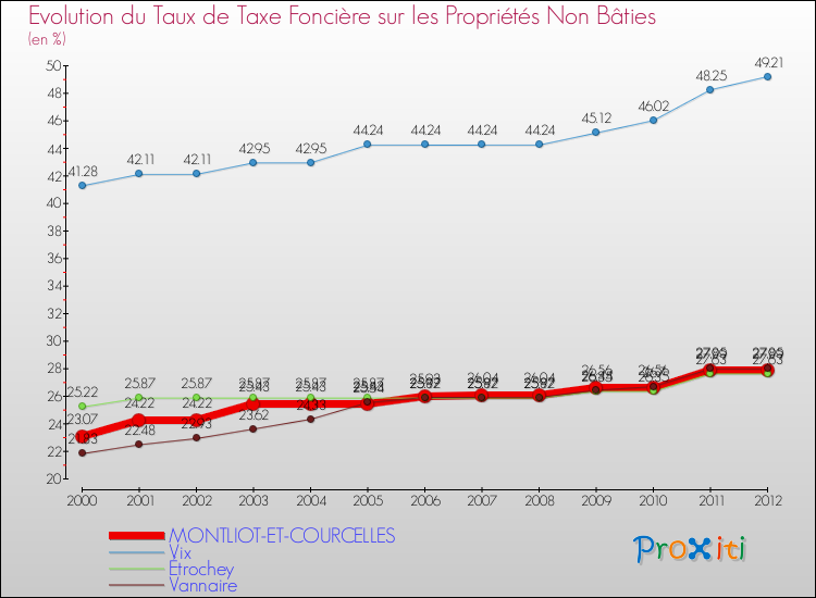 A Montliot-et-Courcelles, le taux de taxe foncière sur le non bâti a donc augmenté de 20.72 % entre 2000 et 2012.