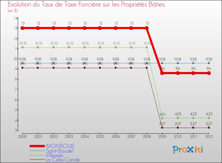 Pendant la même période, les communes françaises similaires à Montlouis, ont vu leur taux de taxe foncière sur le bâti baisser de 8.77 % en moyenne entre 2000 et 2012.