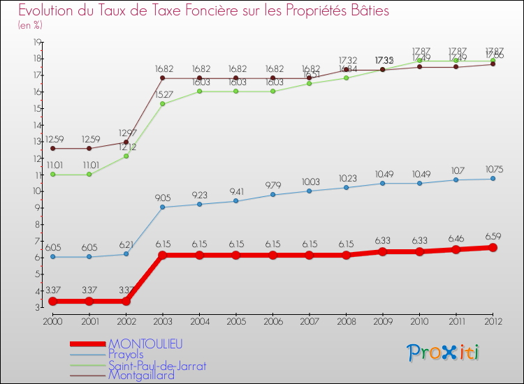 A Montoulieu, le taux de taxe foncière sur le bâti a donc augmenté de 95.55 % entre 2000 et 2012.