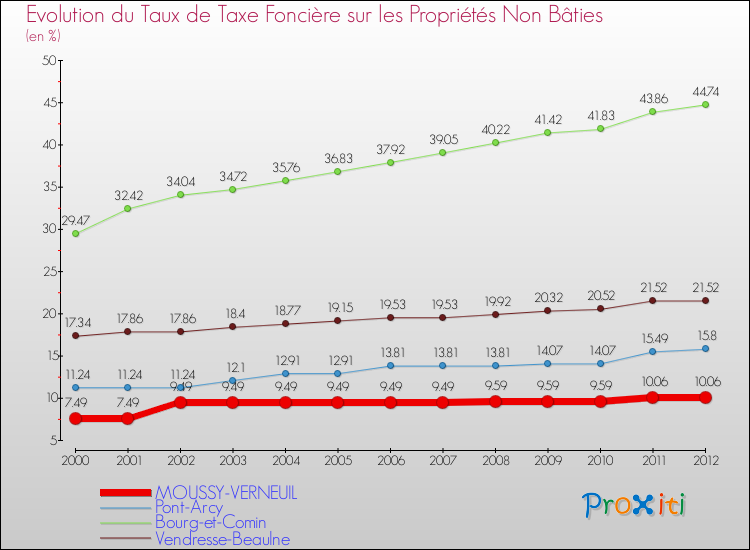 En 2012, le taux de la taxe foncière sur le non bâti vôté par le conseil municipal de Moussy-Verneuil était de : 10.06 %.