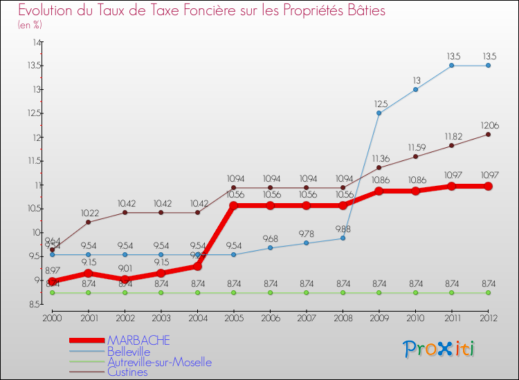En 2012, le taux de la taxe foncière sur le bâti vôté par le conseil municipal de Marbache était de : 10.97 %.