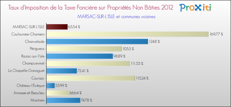 Pendant la même période, les communes françaises similaires à Marsac-sur-l'Isle, ont vu leur taux de taxe foncière sur le non bâti augmenter de 12.08 % en moyenne entre 2000 et 2012.