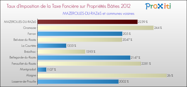 En 2012, le taux de la taxe foncière sur le bâti vôté par le conseil municipal de Mazerolles-du-Razès était de : 22.39 %.