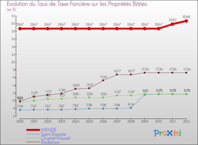 A Mende, le taux de taxe foncière sur le bâti a donc augmenté de 7.01 % entre 2000 et 2012.