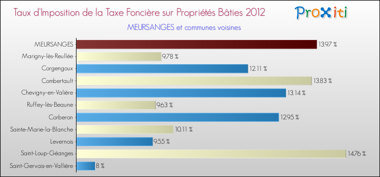 A noter : la valeur moyenne de ce taux de taxe foncière sur le bâti dans les communes françaises similaires à Meursanges était de 14.72 %, en 2012.