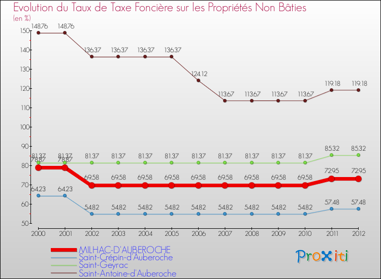 A Milhac-d'Auberoche, le taux de taxe foncière sur le non bâti a donc baissé de 7.51 % entre 2000 et 2012.