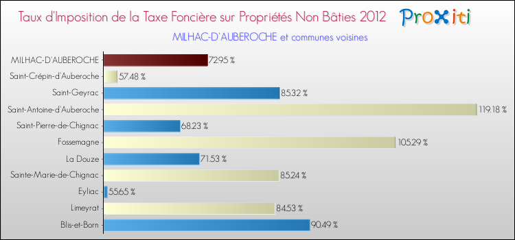 En 2012, le taux de la taxe foncière sur le non bâti vôté par le conseil municipal de Milhac-d'Auberoche était de : 72.95 %.