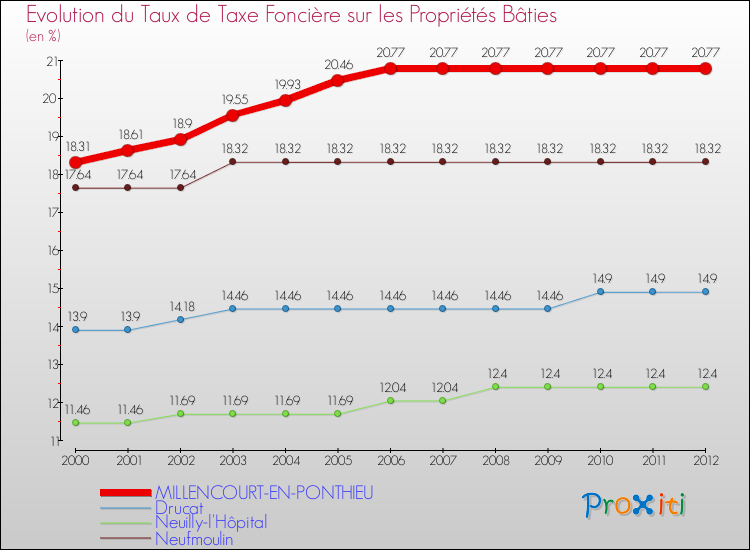 A Millencourt-en-Ponthieu, le taux de taxe foncière sur le non bâti a donc augmenté de 18.71 % entre 2000 et 2012.