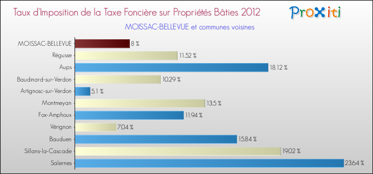 A noter : la valeur moyenne de ce taux de taxe foncière sur le bâti dans les communes françaises similaires à Moissac-Bellevue était de 12.59 %, en 2012.