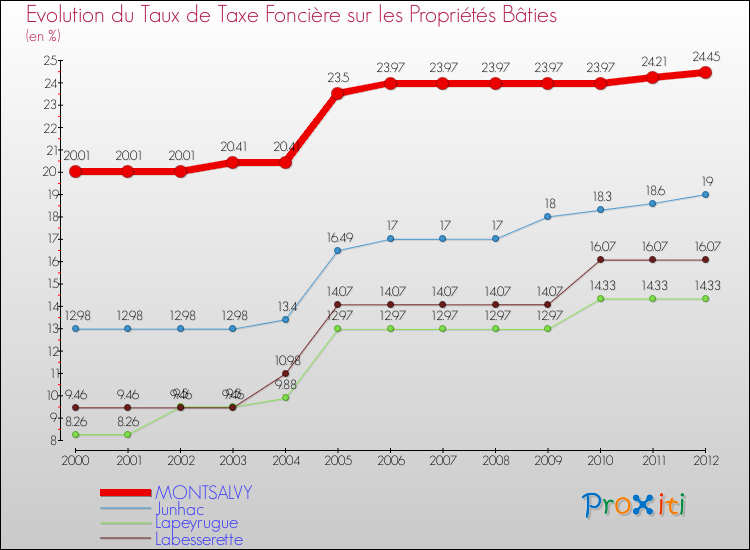 A Montsalvy, le taux de taxe foncière sur le bâti a donc augmenté de 22.19 % entre 2000 et 2012.