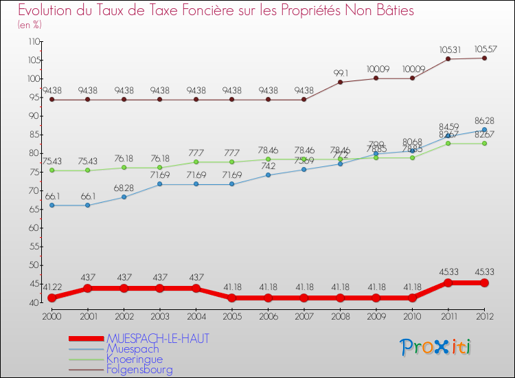 Pendant la même période, les communes françaises similaires à Muespach-le-Haut, ont vu leur taux de taxe foncière sur le non bâti augmenter de 9.55 % en moyenne entre 2000 et 2012.